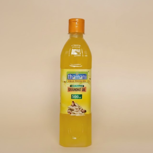 Pure cold-pressed groundnut oil in a 500ml pack, perfect for everyday cooking with natural aroma and taste.